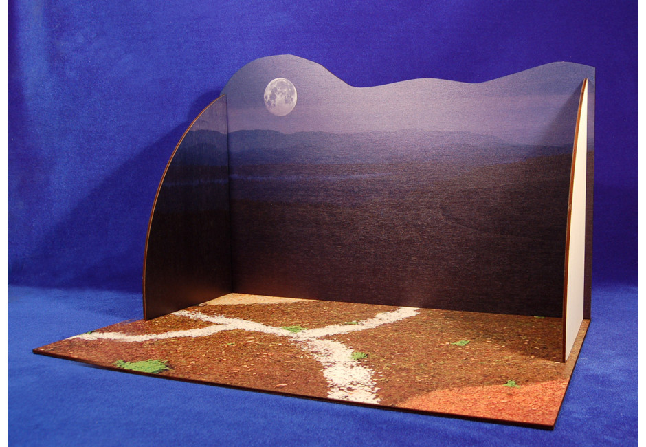 Caja de ambientación para limitar el espacio del pesebre, en el suelo imitando caminos y serrín, en la pared fondo de cielo