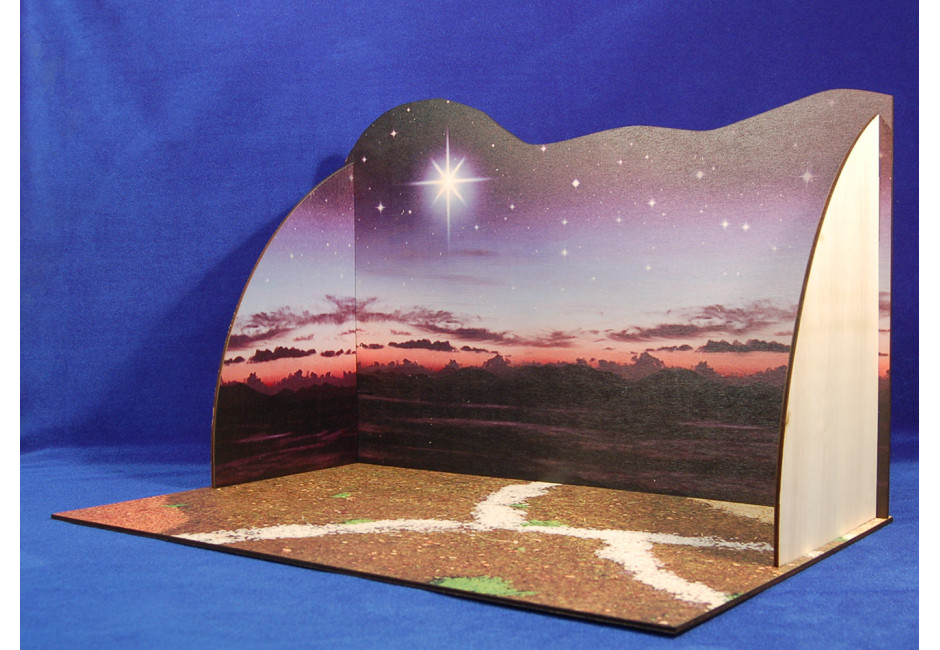 Caja de ambientación para limitar el espacio del pesebre, en el suelo imitando caminos y serrín, en la pared fondo de cielo