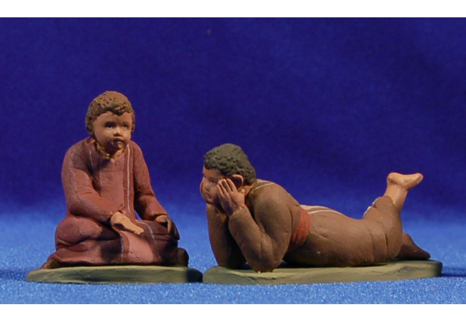 Pareja formado por 2 niños, uno sentado explicando y el otro estirado escuchando, hebreo. La fotografía es orientativa, no hay modelos exactos. Para poner al lado de una casa del belén.
