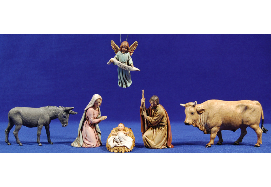 Grupo formado por San José, la Virgen, el Niño Jesús, el buey, la mula y ángel.