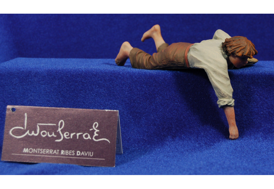 Figura de un pastorcillo joven estirado, con un palo en la mano y el brazo hacia abajo, como si quisiera coger o tocar alguna cosa.