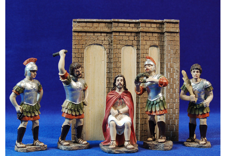 Grupo formado por Jesús con la corona de espinas y cuatro soldados romanos, i part de la muralla.