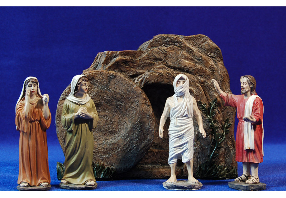 Grupo formado por Jesús resucitando a Lázaro, con dos mujeres y la entrada del sepulcro.